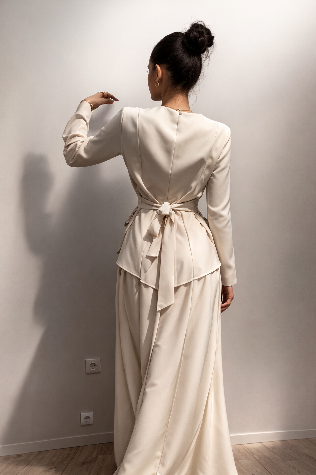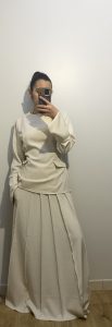 Élégance minimaliste et allure intemporelle définissent cet ensemble raffiné en ton crème. Composé d’un haut structuré à manches longues légèrement évasées et d’une jupe longue fluide aux plis délicats, il sublime la silhouette avec modernité et sobriété.
